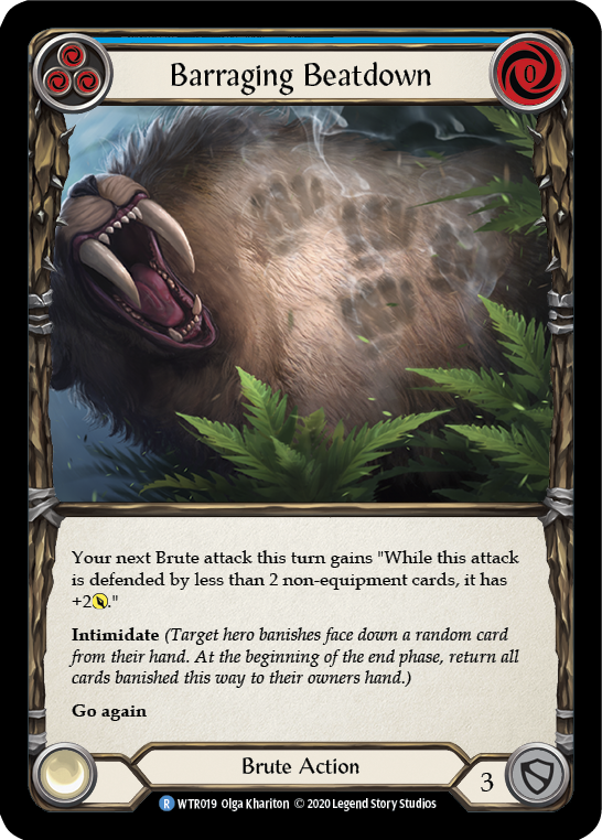 Your next Brute attack this turn gains "While this attack is defended by less than 2 non-equipment cards, it gains +2 [Power]." Intimidate (Target hero banishes face down a random card from their hand. At the beginning of the end phase, return all cards banished this way to their owners hand.) Go again