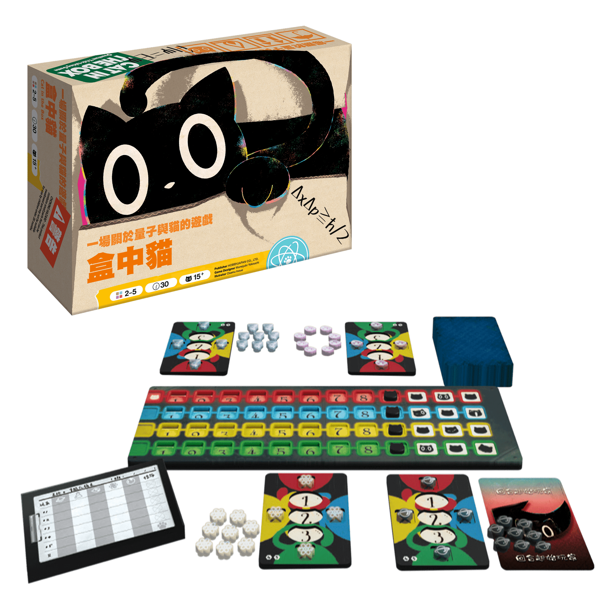 Cat in the Box: Deluxe Edition is the quintessential quantum trick-taking card game for 2 - 5 cool cats, where your card’s color isn’t defined until you play it! Hypothesize how many tricks you will win, and record your bid. Place tokens on the community research board as you play your hand, and connect large groups of tokens to score even more points. Plan your tricks carefully as you cannot claim the color of a card with the same number that has already been declared. Doing so would be pawsitively catastrophic as you have just created a paradox!